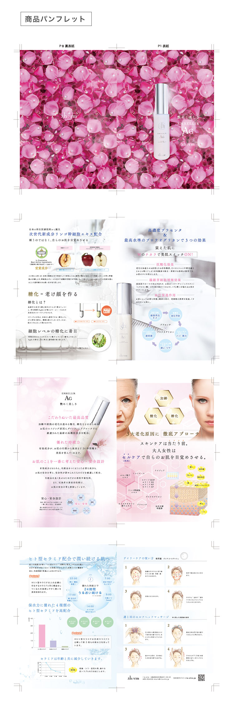 オリジナルコスメブランド『sharm』ロゴ作成、商品パッケージ、パンフレット、LPを作成させていただきました。