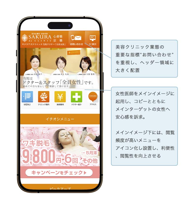 ・旧サイトには医師やスタッフが出ておらず、美容医療という業種のサイトとして信頼感にかけていた。そのため、医師やスタッフをサイトに登場させ生活者からの信頼感・安心感を向上させました。