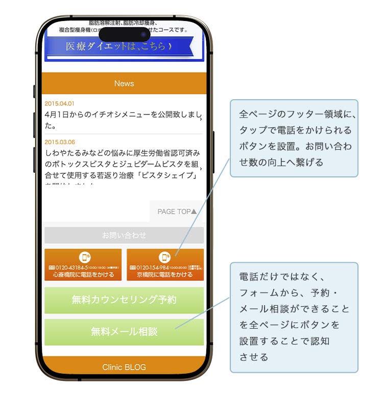 スマートフォン用サイトではボタンタップでの電話やgoogle mapでの地図表示など生活者が便利に使える機能を実装しました。