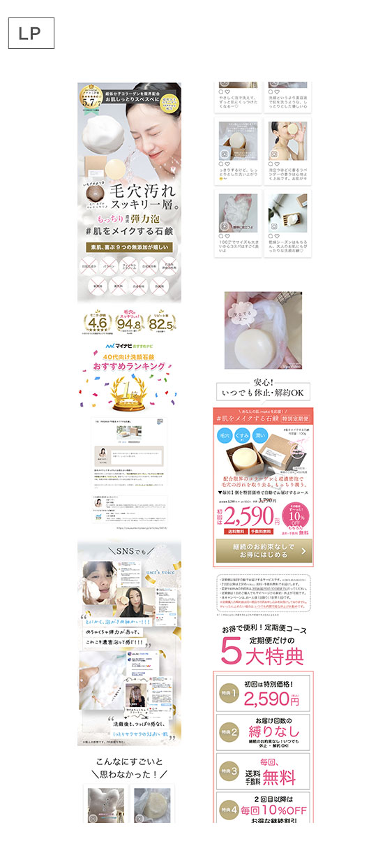 洗顔石鹸という商材から想起される『シンプル&クリーン』というイメージでデザインを発注して作成したサイトを、モニター施策による感想、購入者からの感想、アフィリエイターへのヒアリングなどを通じて、具体的な顧客層が抱える悩みにフォーカスし『悩みを心地よく解決できるアイテム』として位置付けることにし、デザイン・文言などを改修していきました。